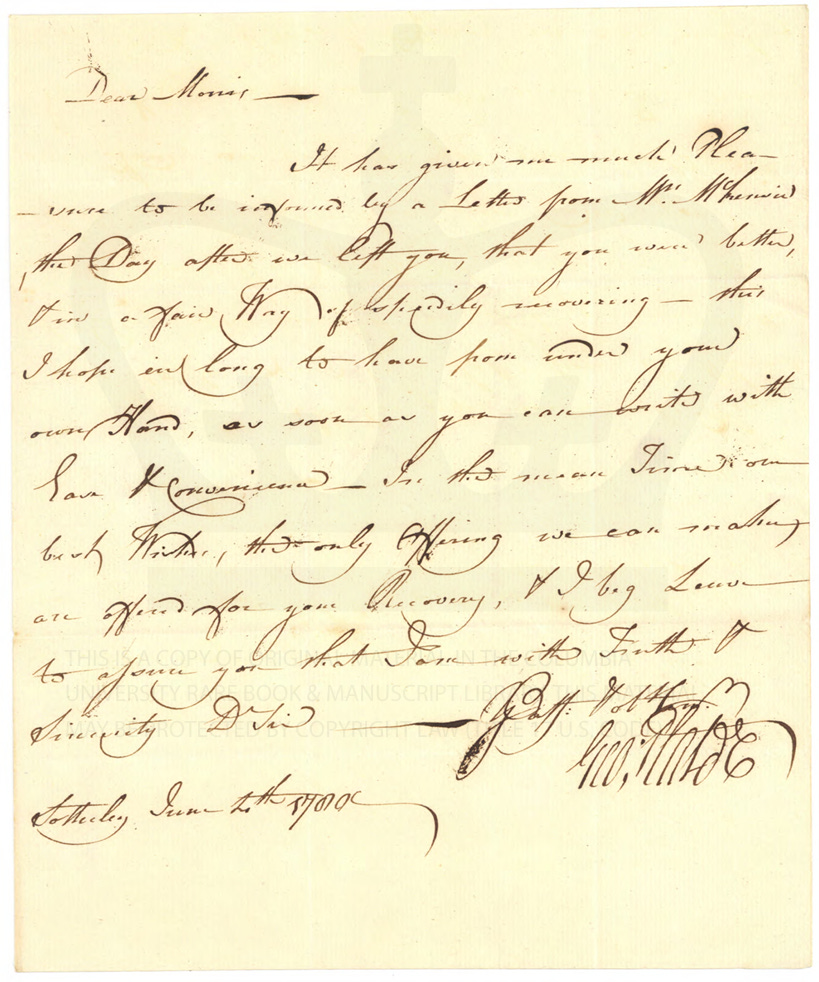 I have the Pleasure of two Letters from you, the last of 24th June in which you are pleased to congratulate me upon my Resurrection. I cannot say what induced Mr. [James] to kill me, but this I can say that the Health of my Body is perfect.*