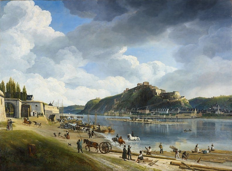 Bei der Einfahrt nach Koblenz überqueren wir die Mosel auf einer schönen Steinbrücke. Die Entfernung zu unserem letzten Posthaus beträgt etwa zwölf Meilen, die Dank unseres ersten Postillons zweieinhalb Stunden aufgefressen hat.